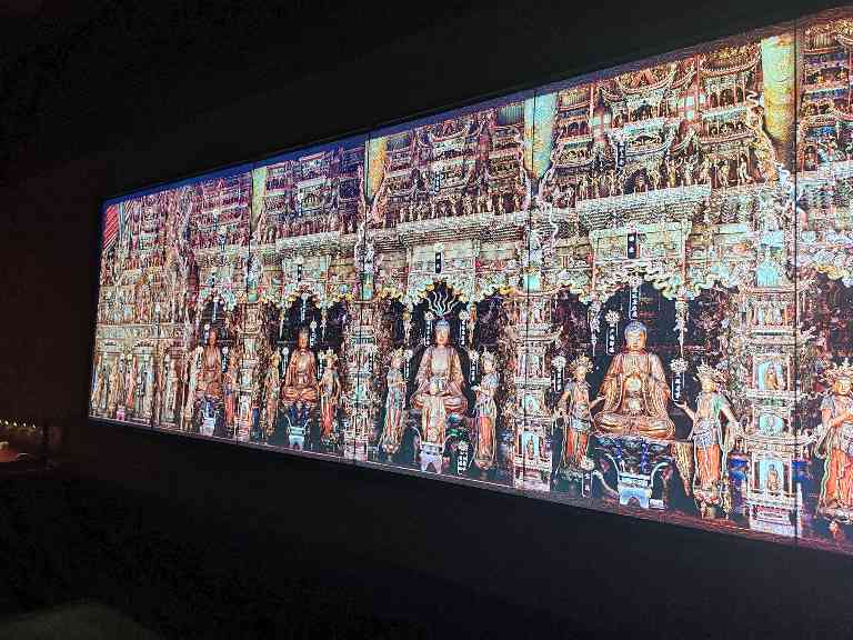 展览主办单位耗时超两个月,综合运用视觉算法建模、AI重建等数字技术,完成了对小西天大雄宝殿毫米级精度的数字化采集,搭建了百亿面数的超拟真数字模型。在“数字档案”的基础上,展览深度活化小西天高精度数字扫描成果,不仅1:1高保真3D打印复原核心佛龛、打造悬塑全景沉浸式交互解读,还打破了传统展览模式的地域和空间限制,将这座屹立于凤凰山之巅、难以尽览细节的“悬塑艺术殿堂”,通过AI、3D+VR虚拟现实技术等创新手段,完美“迁移”至北京,将不可移动的悬塑艺术转化成为使观众“身临其境”的深度沉浸式体验。